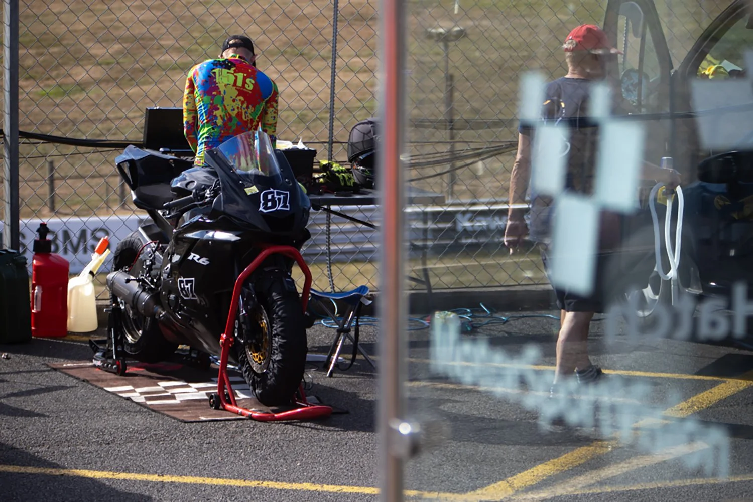 Two motorcycle racers in racing suits standing in garage with racing motorcycles, discussing, with a large Michelin banner on the wall behind them. Several racing bikes and gear around them, including a red cover on a motorcycle and a cardboard box. Outside the garage, cars can be seen.